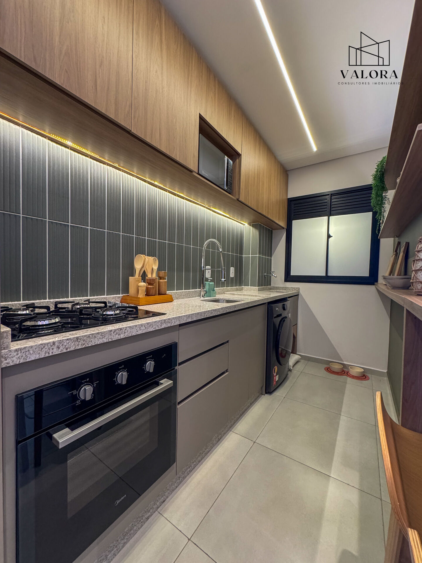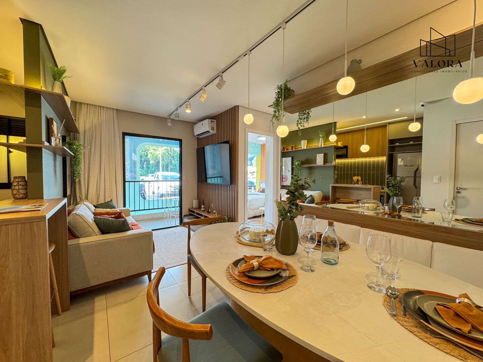 O projeto adota arquitetura contemporânea, com piso cerâmico retificado 68x68 cm em toda a unidade, esquadrias em alumínio e infraestrutura seca para ar-condicionado na sala de estar e no dormitório do casal. Há opções de unidades com giardino, proporcionando área externa privativa.