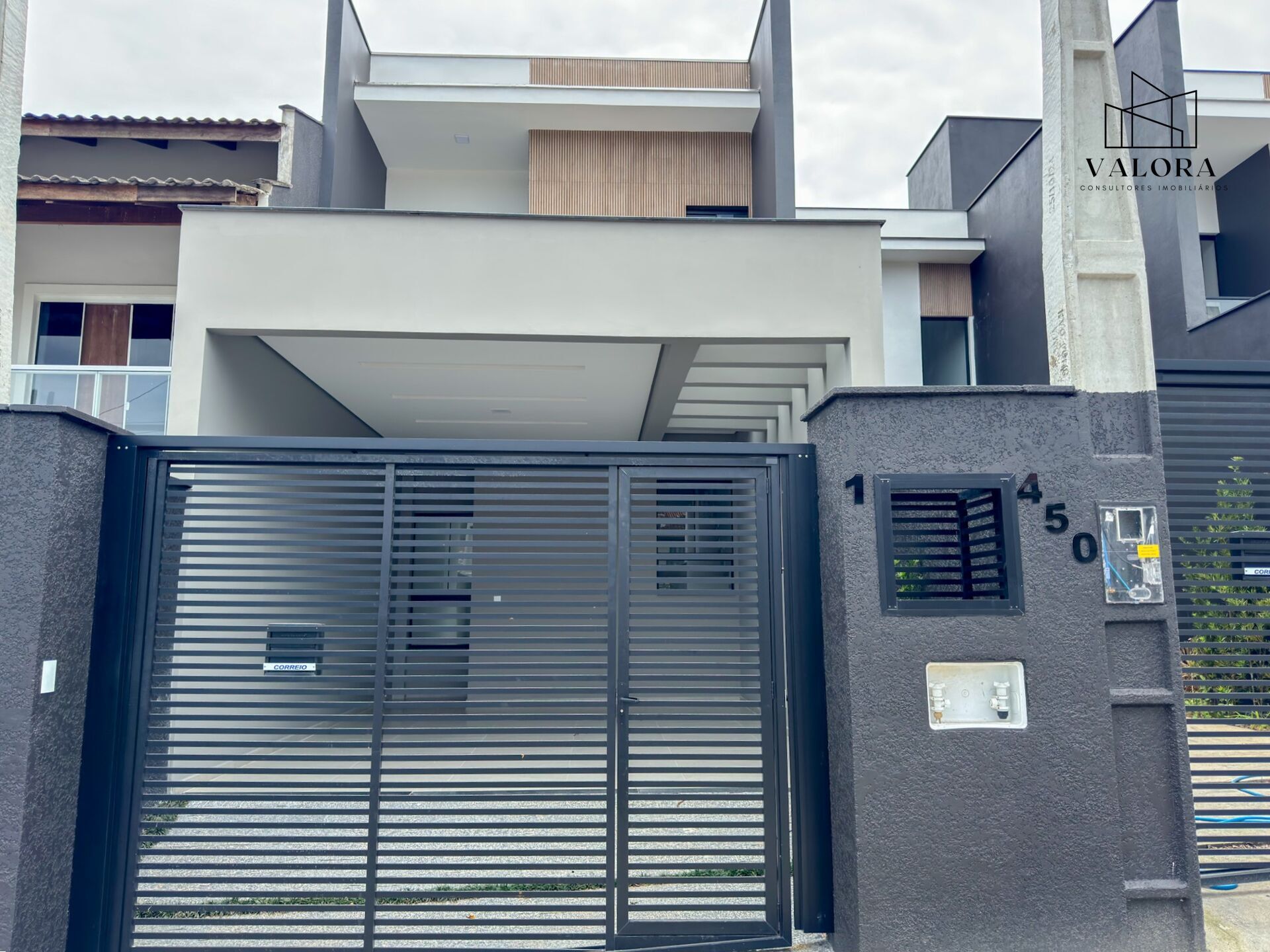 No pavimento superior, a área íntima é bem distribuída, com uma suíte que dispõe de varanda, além de dois dormitórios e um banheiro social. O imóvel apresenta acabamento de nível superior, com pisos em porcelanato e vinílico, esquadrias pretas, teto com rebaixo em gesso, portas laqueadas, portão de elevação e infraestrutura para instalação de ar-condicionado.