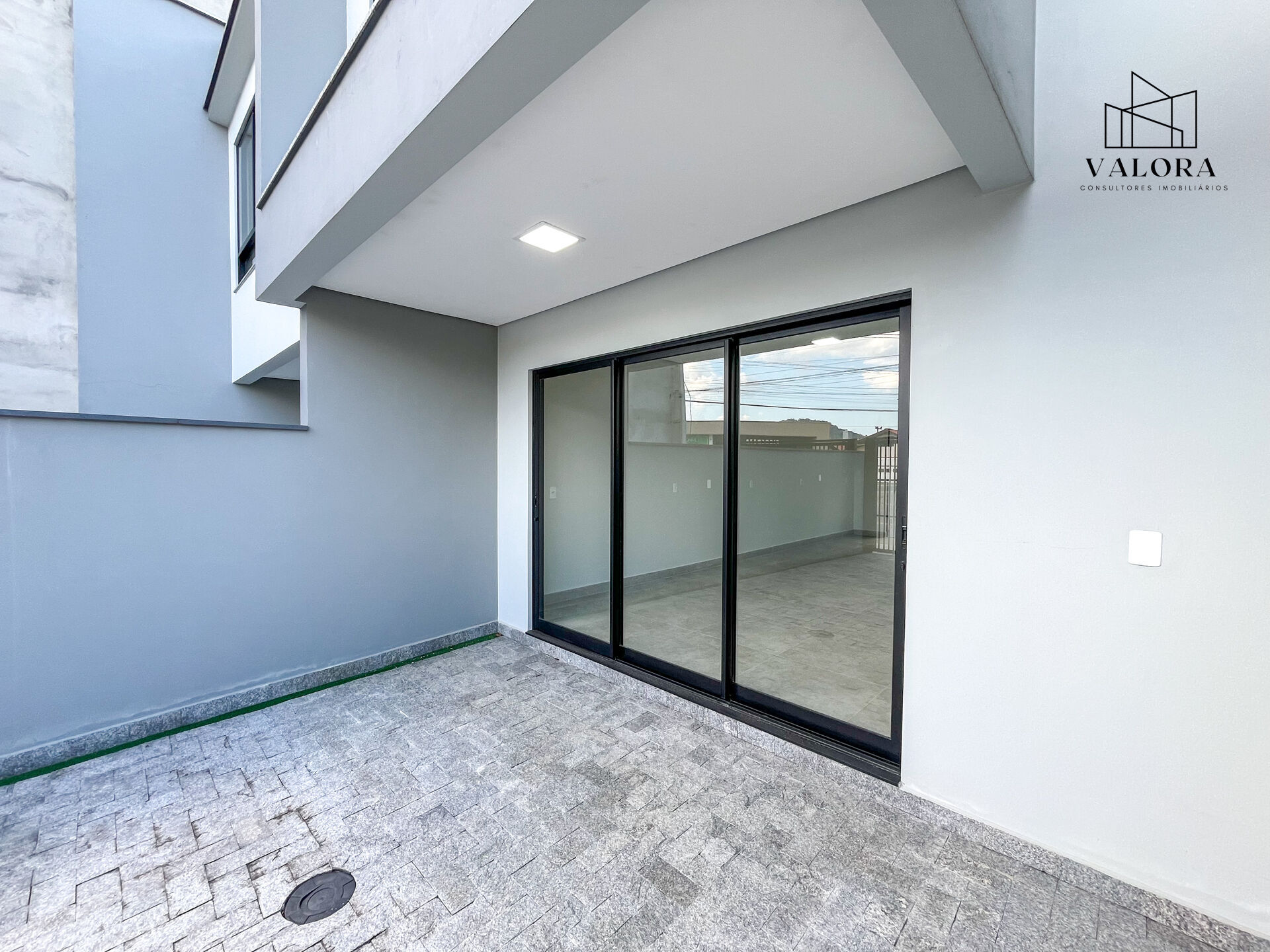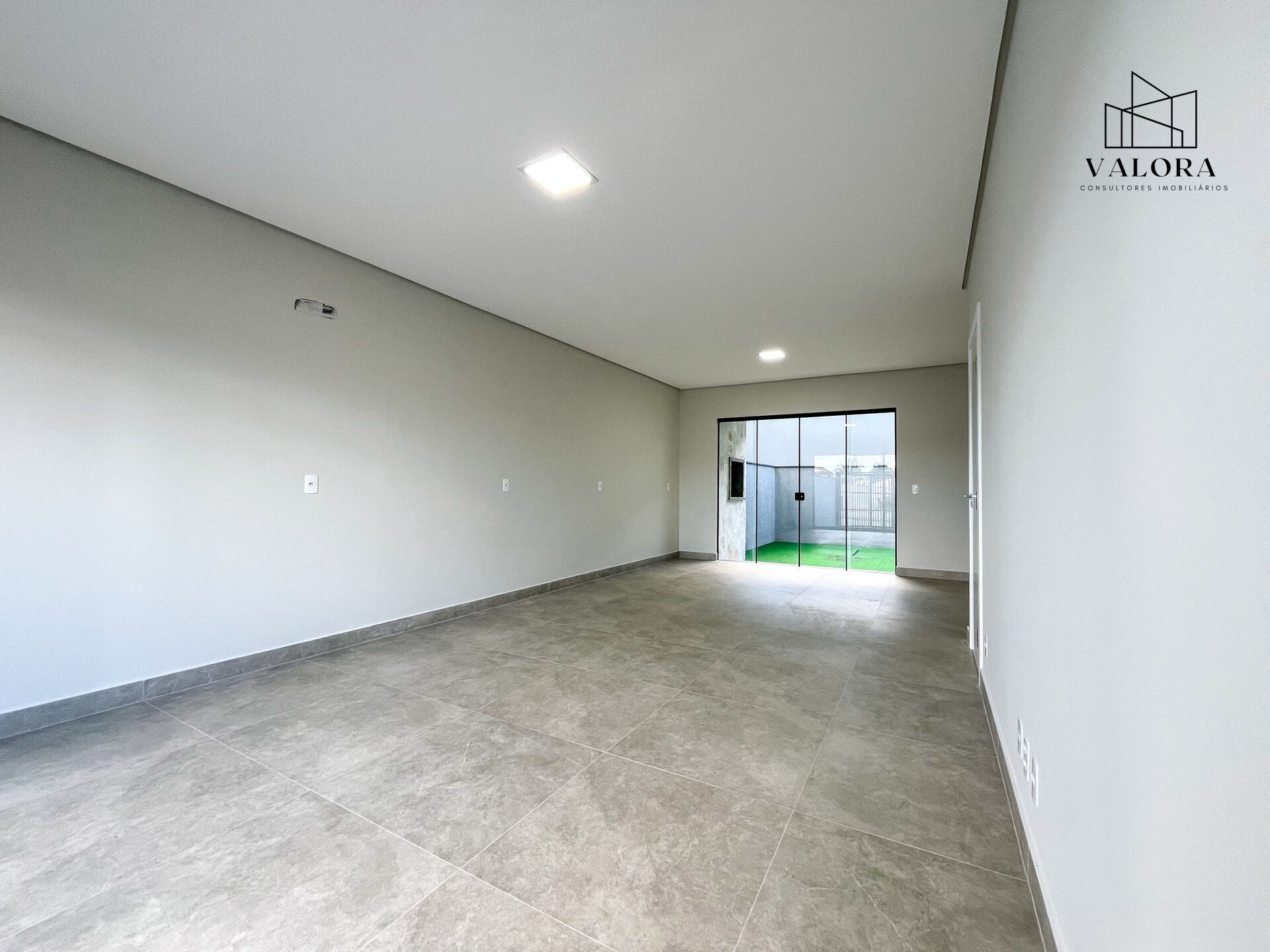 No pavimento térreo, a área social é composta por sala e cozinha integradas, formando um living contínuo, onde também se insere o lavabo. O layout favorece a circulação e o uso cotidiano dos espaços. A lavanderia é externa e coberta. Todo o nível inferior conta com acabamento em porcelanato e, nos fundos, há espaço com churrasqueira a carvão.